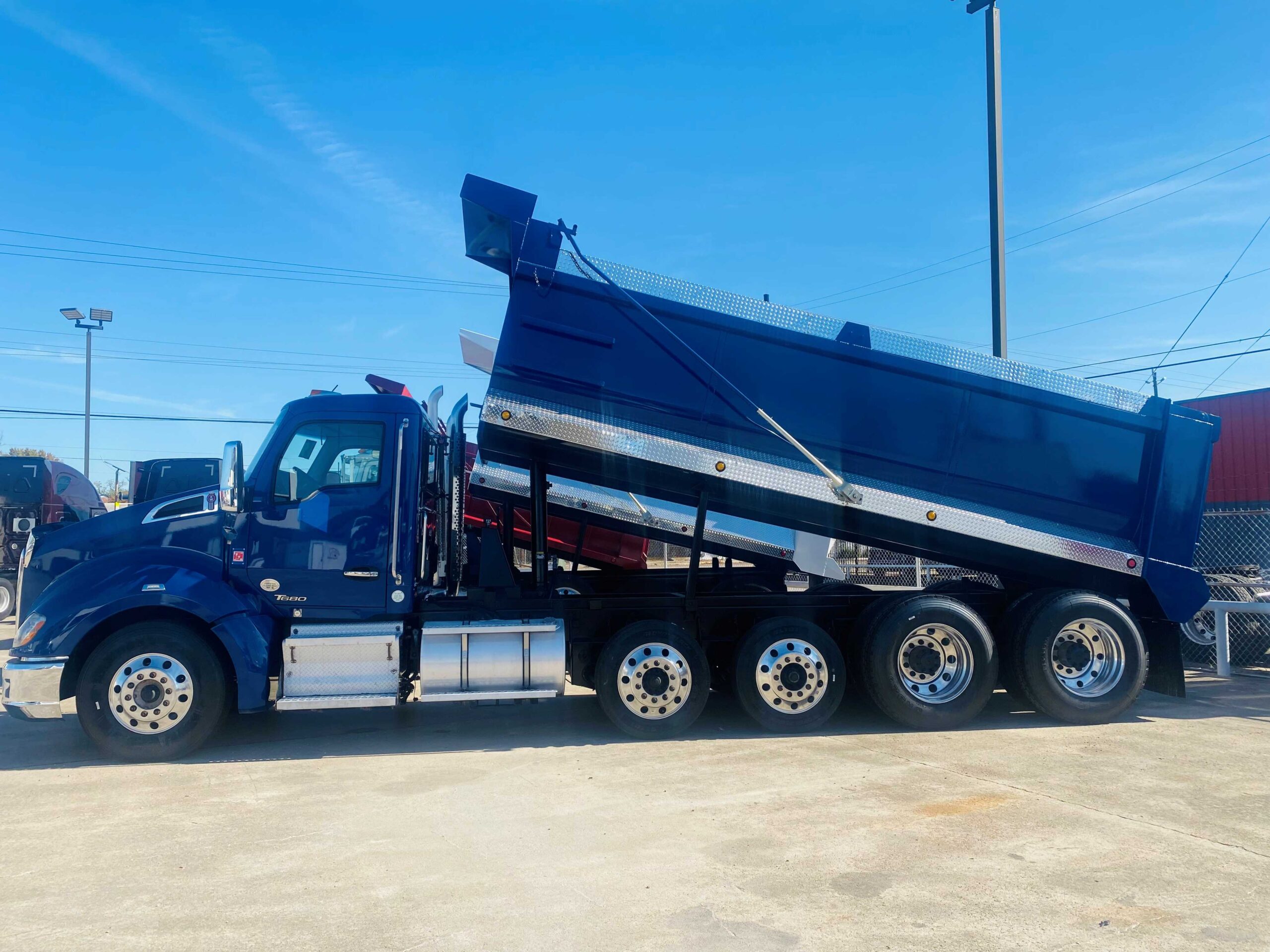 STOCK #2471342019 KENWORTH T680DUMP TRUCK, CUMMINS X15, 450 HP, AUTOMATIC, 520240 MILES, 20FT SEMI-ROUND BED, QUAD-AXLE, NEW TIRES 315 FRONT, 24.5/11R RARE 255 DROP AXLES